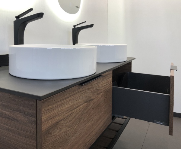 COMFORTY. Тумба-умывальник "Порто-75" дуб тёмно-коричневый с черной столешницей c раковиной COMFORTY 9110