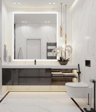 При изготовления мебели для ванной мы используем только высококачественные влагостойкие материалы и современные технологии, обеспечивающие высокое качество поверхностей, позволяющие использовать мебель в условиях перепада температур и повышенной влажности.